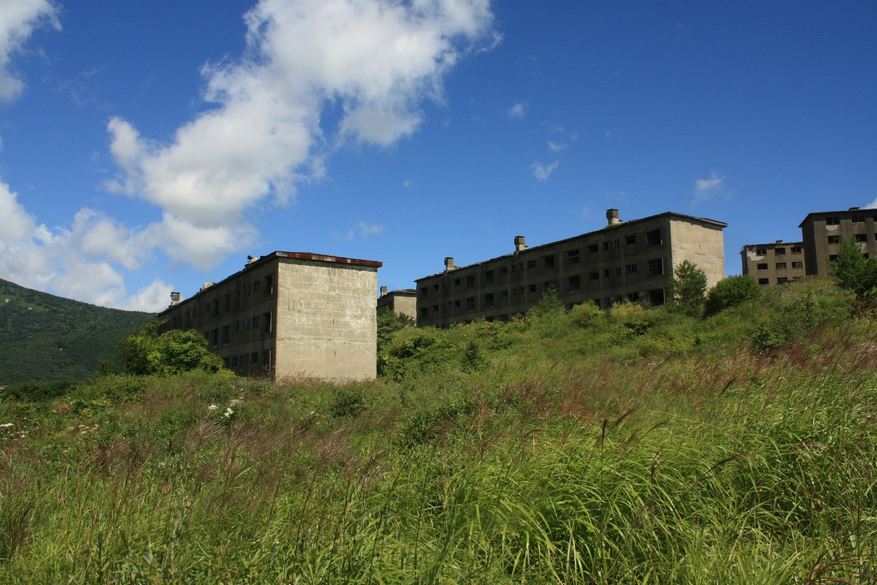 ここに着くやそれまで空を覆っていた雲が晴れ、かつての栄華を伝えるアパート群に陽が当たりました。