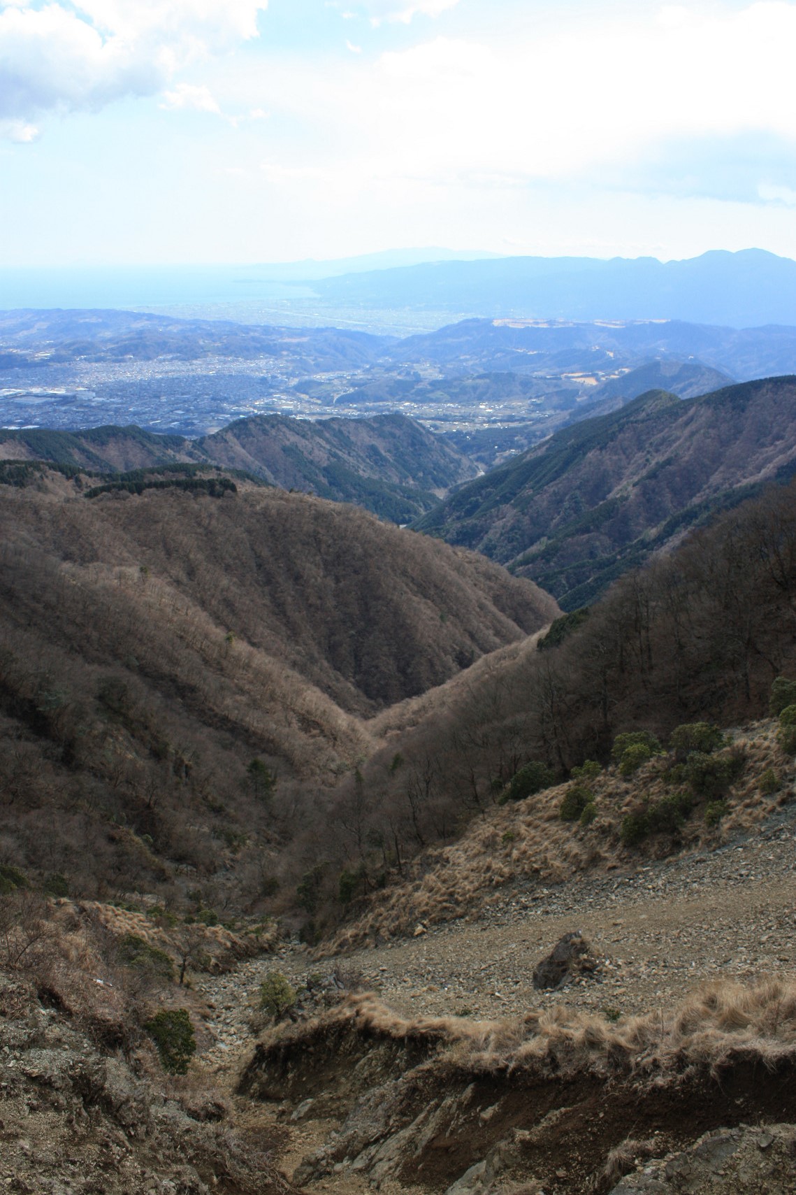 3月、丹沢表尾根より南方向。大規模な崩壊地の向こうに相模湾と箱根の山。